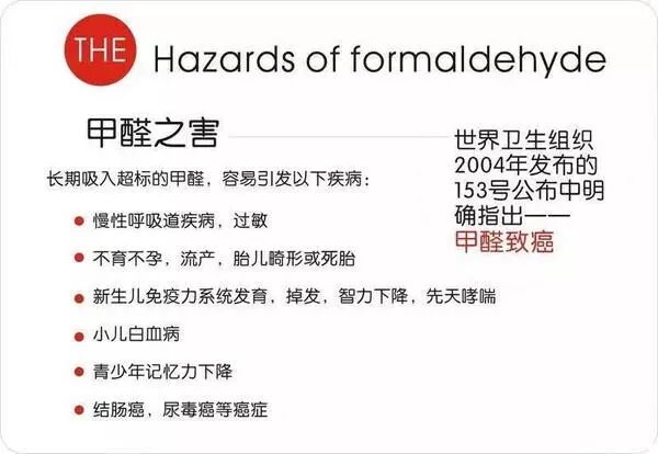 甲醛是一种致癌物质,如果长期接受的话,可能会引起癌症的发生。如果你吸入的甲醛浓度过高,会引起支气管、哮喘等疾病。还可以导致皮肤炎症、婴儿畸形等。