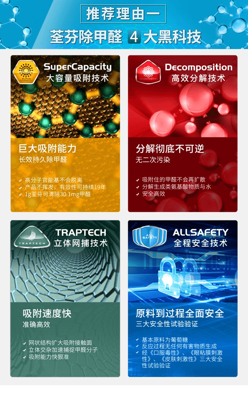 所以荃芬不同于市面上其他产品,不是光触媒,不是生物酶,不是封闭剂,无须高温熏蒸,不需要紫外线照射就可以高效去除甲醛。
